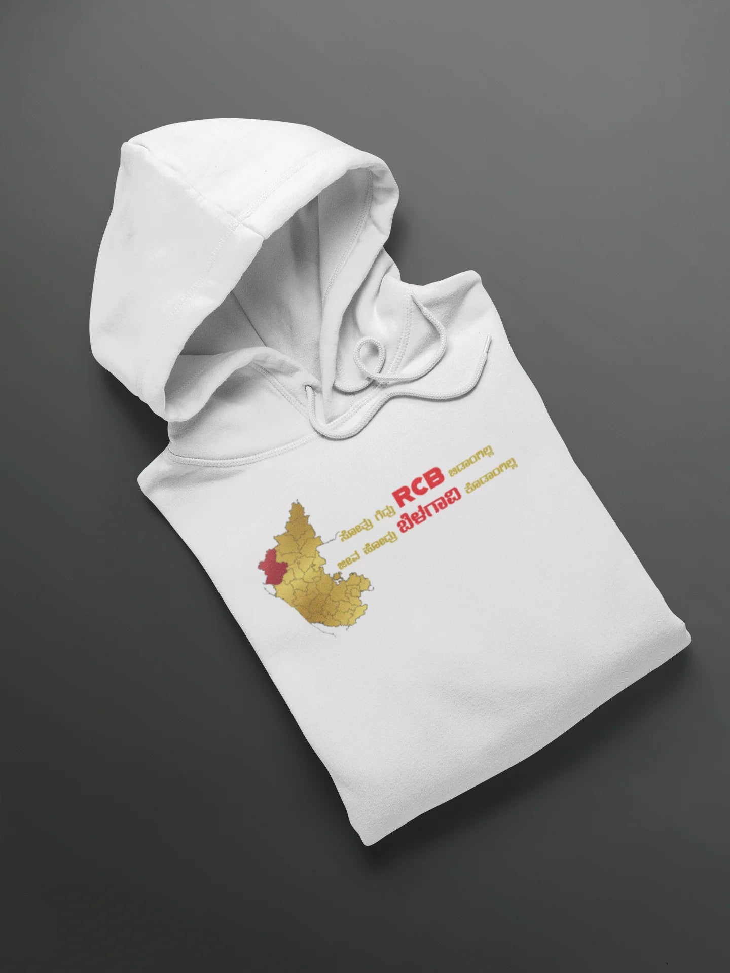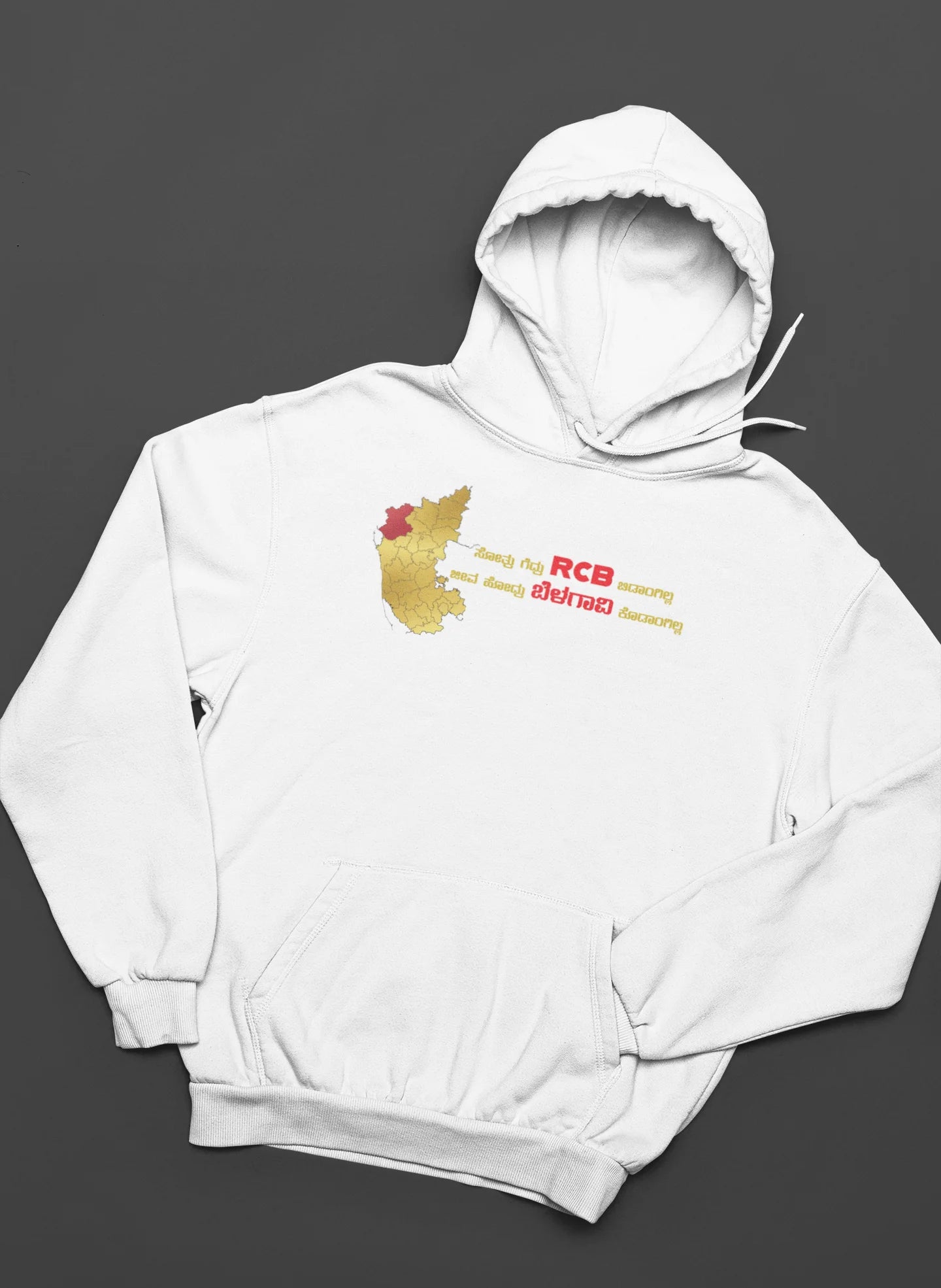 ಸೋತ್ರು ಗೆದ್ರು RCB ಬಿಡಾಂಗಿಲ್ಲ ಜೀವ ಹೋದ್ರು ಬೆಳಗಾವಿ ಕೊಡಾಂಗಿಲ್ಲ Printed Hoodie | Belagavi x RCB Slogan Hoodie | White | ShirtlessClub