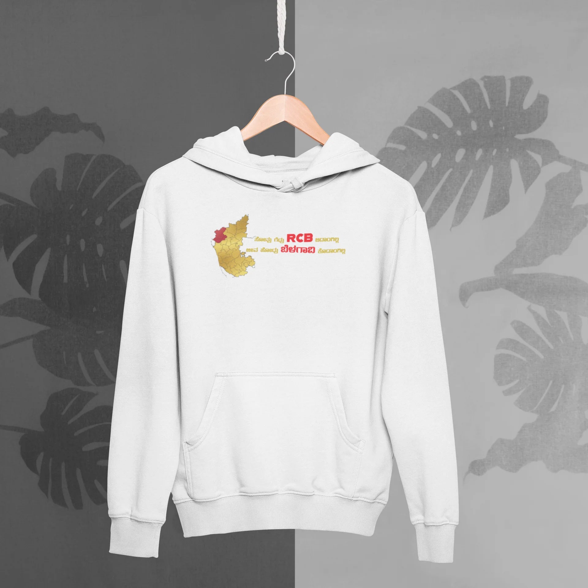 Express Belagavi passion and RCB fandom—ಸೋತ್ರು ಗೆದ್ರು RCB ಬಿಡಾಂಗಿಲ್ಲ जीव ಹೋದ್ರು ಬೆಳಗಾವಿ ಕೊಡಾಂಗಿಲ್ಲ premium white hoodie. Soft fleece, bold slogan chest print. Corporate, Rajyothsava, trekking style. Order now!