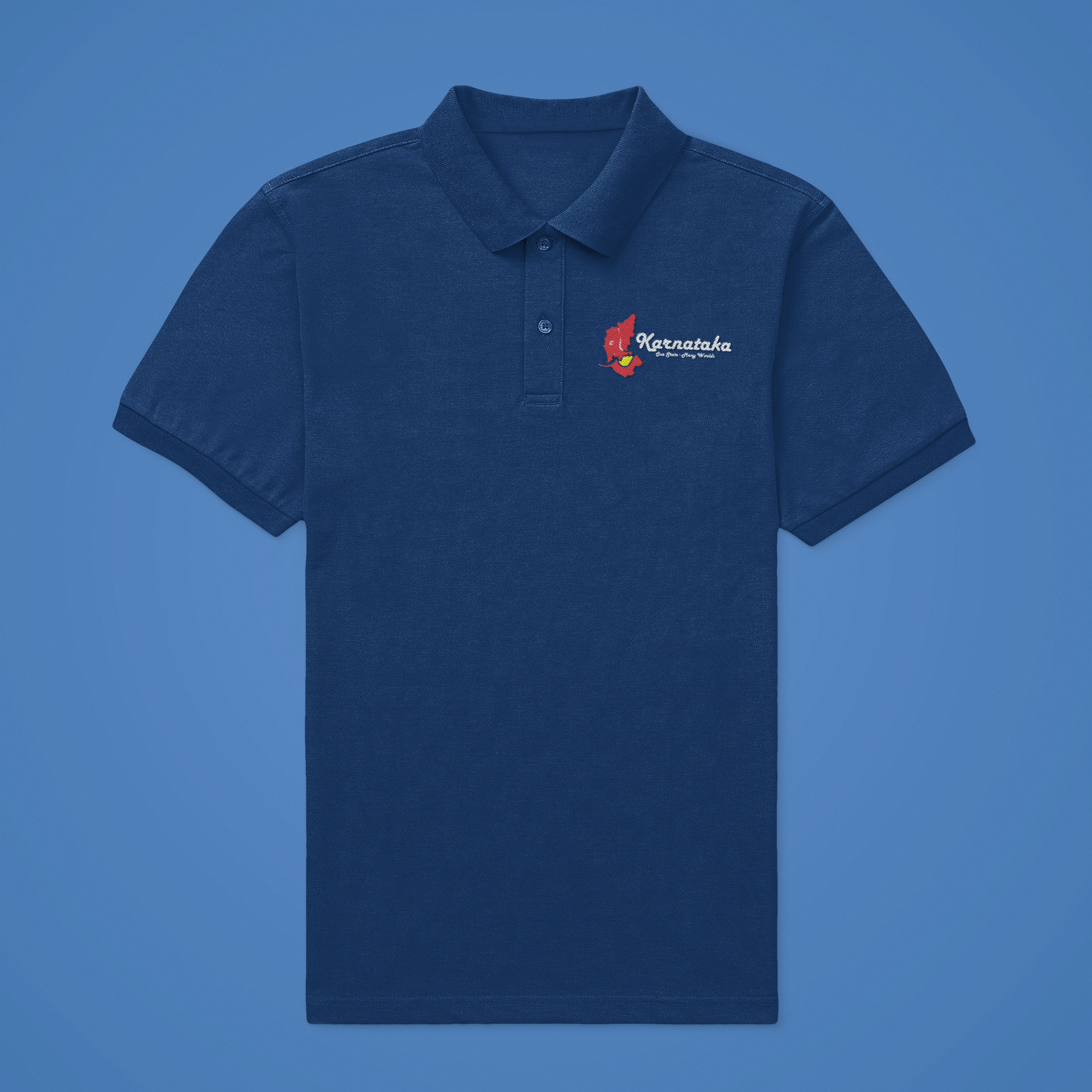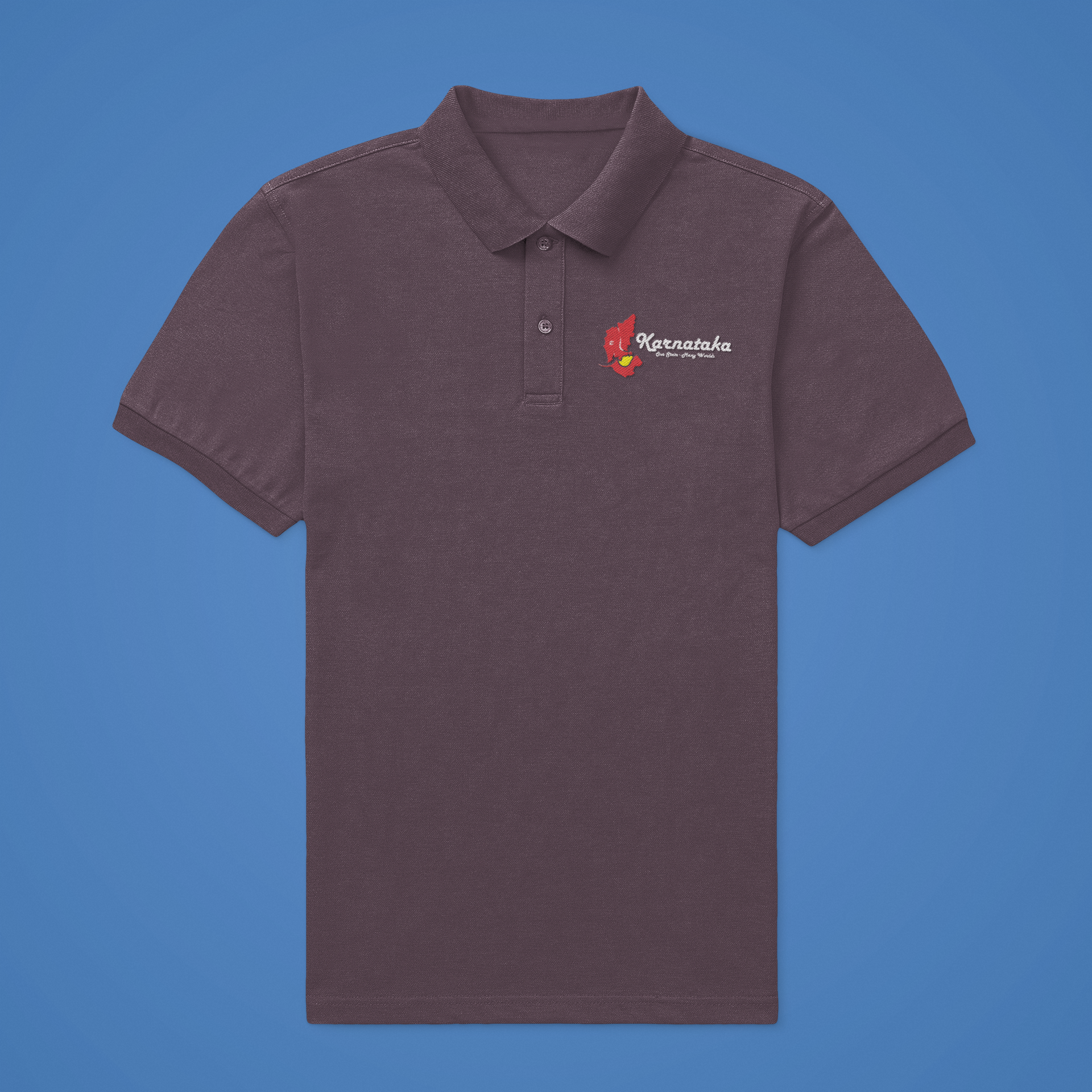 Show Karnataka pride for office, trekking, and travel with the "Karnataka One State Many World" Polo Tshirt. White chest print on Black, Brown, Blue. Premium cotton, bio-washed. Order now!